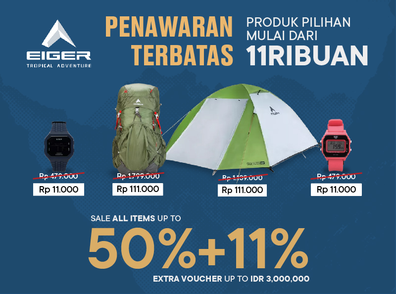 Eigerian, yuk sambut akhir tahun dengan rencana petualangan baru. Persiapkan segala kebutuhanmu kembali untuk sambut musim liburan. EIGER Shopping Festival 11.11 hadir dengan pilihan produk yang bisa kamu pilih. Ngga perlu khawatir, semua produk pilihan bisa kamu dapatkan dengan harga crazy price EIGER mulai dari 11Ribuan aja. Yuk cek daftar barangnya di sini! Ada juga penawaran promo eksklusif yang hanya ada di EIGER Shopping Festival 11.11