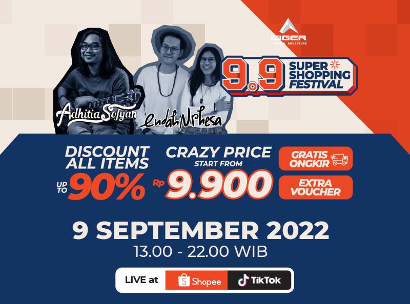 Jangan lewatkan juga keseruan kegiatan EIGER 9.9 Super Shopping Festival pada tanggal 9 September 2022 nanti di instagram @eigeradventurecom untuk menikmati penampilan spesial dari Adhitia Sofyan dan Endah N Rhesa. Kapan lagi bisa belanja online sambil nikmatin live music performance, kalau bukan di EIGER 9.9 Super Shopping Festival!