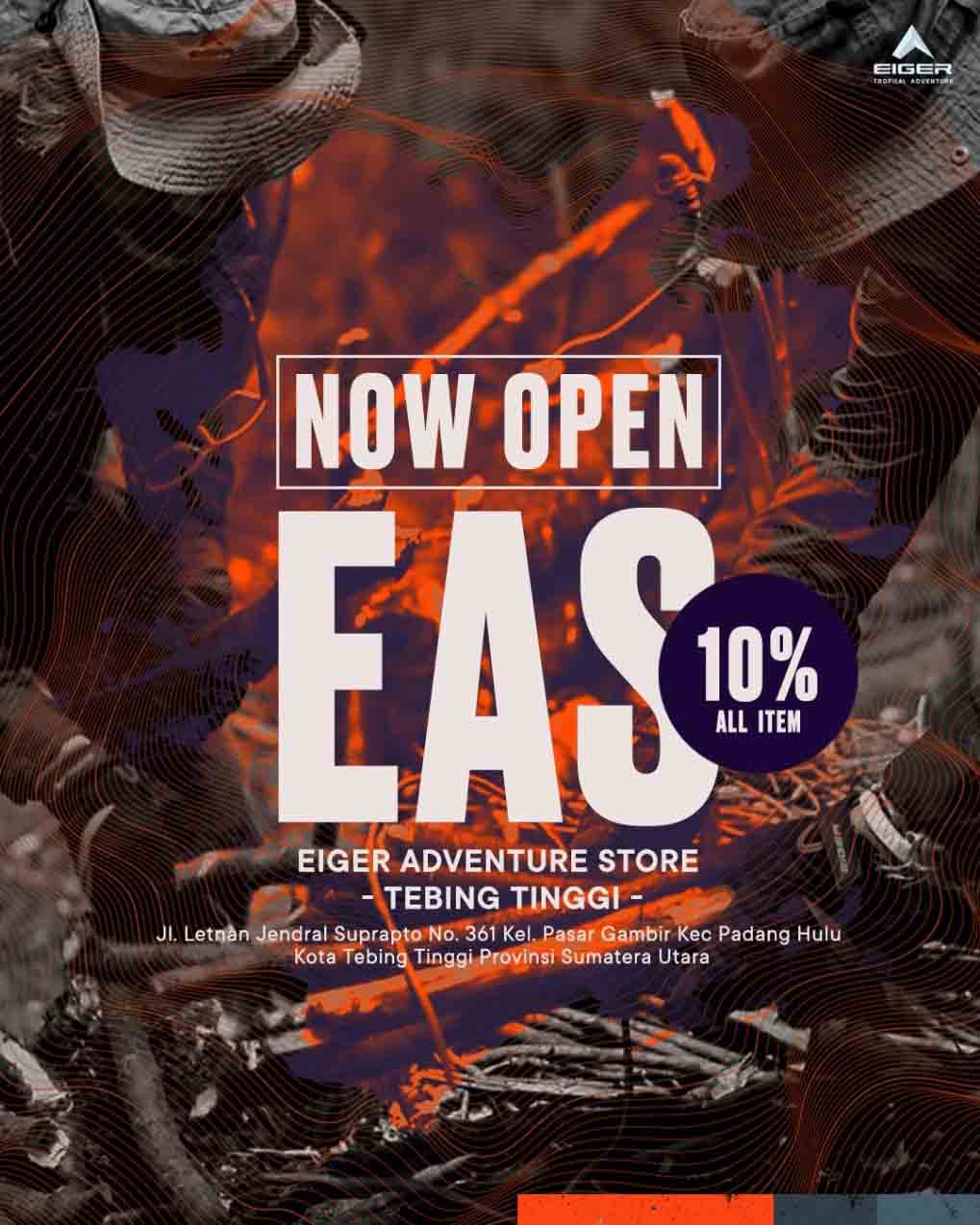 Now open! Eiger Adventure Store Tebing Tinggi. Ada diskon 10% untuk semua produk.