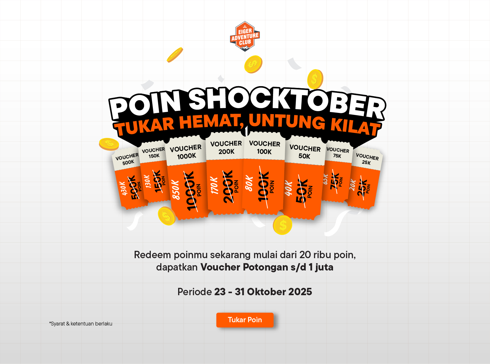 Mulai tanggal 22–31 Oktober 2025, kamu bisa menukar minimal 20 ribu poin EAC dengan berbagai voucher belanja eksklusif sampai dengan voucher 1 juta. Voucher ini bisa digunakan di seluruh Official Store EIGER Adventure, Aplikasi EIGER Adventure, dan website eigeradventure.com.