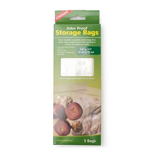 Odor Proof Storage Bags dari Coghlans terbuat dari 3.6 mil plastik yang tebal dan sangat kuat serta aman untuk makanan. Dengan segel yang kedap udara yang dapat mencegah bau tak sedap dan membuat makanan tetap lembut walaupun sudah dilepaskan selama beberapa minggu. Kantong yang dapat digunakan juga untuk laundry, menyimpan umpan, dll. Produk ini aman untuk makanan dan bebas dari bahan BPA, serta dapat digunakan kembali dan aman disimpan di freezer. 1 paket terdiri dari 5 buah kantong.